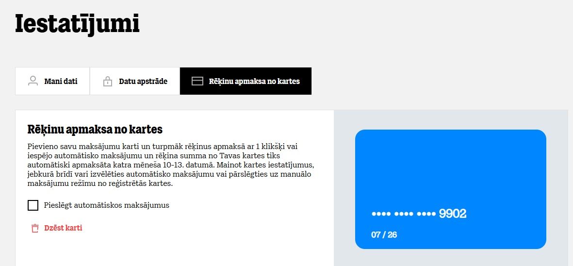 Kā es varu atslēgt automātisko rēķinu apmaksu no kartes?