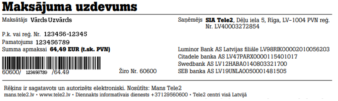 Kā es varu samaksāt rēķinu un kāds ir Tele2 bankas konts?