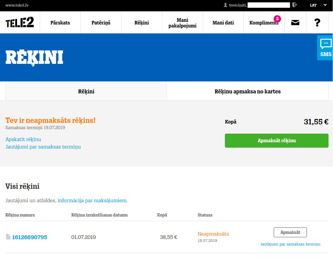 Mans Tele2 nekur neatrodu savu rēķinu, nav tādas sadaļas “Rēķini”.