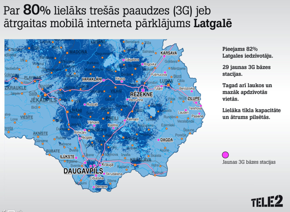 Tīkla modernizācijas ietvaros Latgalē Tele2 nomainīja aparatūru esošajās bāzes stacijās, kā arī uzbūvēja 29 jaunas trešās paaudzes jeb 3G bāzes stacijas. Rezultātā šī reģiona iedzīvotājiem ir pieejams vēl ātrāks mobilais internets ar plašāku pārklājumu un kvalitatīvāku balss pārraidi. Tagad Tele2 ātrgaitas mobilais internets ir pieejams ne tikai pilsētās, bet arī mazāk apdzīvotos pagastos un ciemos.