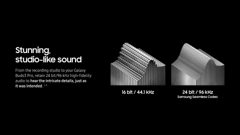 Saglabā īpaši augstas kvalitātes audio no ierakstu studijas savās Galaxy Buds3 Pro austiņās. Samsung Seamless Codec saspiež un kodē līdz pat 24 bitu / 96 kHz audio. Pēc tam dekodē Galaxy Buds3 Pro austiņās, saglabājot 24 bitu / 96 kHz augstas precizitātes skaņu, lai Tu varētu sadzirdēt izsmalcinātās detaļas tieši tā, kā tas bija paredzēts.